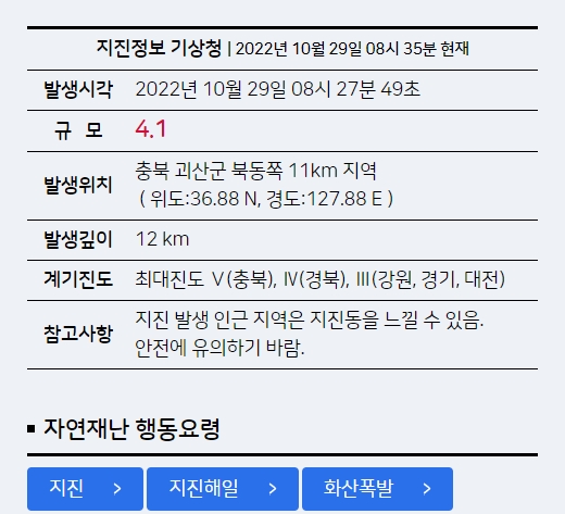 이벤트 당첨자 발표 보너스 지진안전 캠페인 출석 체크 이벤트 행정안전부 2022년 지진안전 온라인 캠페인에 보내주신 많은 관심과 참여에 감사드립니다. 충청북도 괴산군 북동쪽 11km 지역 본진 1 규모. 이와 관련 지진 발생지와 인접한 괴산군 감물면 구월리에 거주하는 한 주민은 폭탄 터지는 소리가 났고 집이 많이 흔들렸다며 여태 살면서 이렇게 큰 흔들림을 느낀 지진은 처음이라고.
